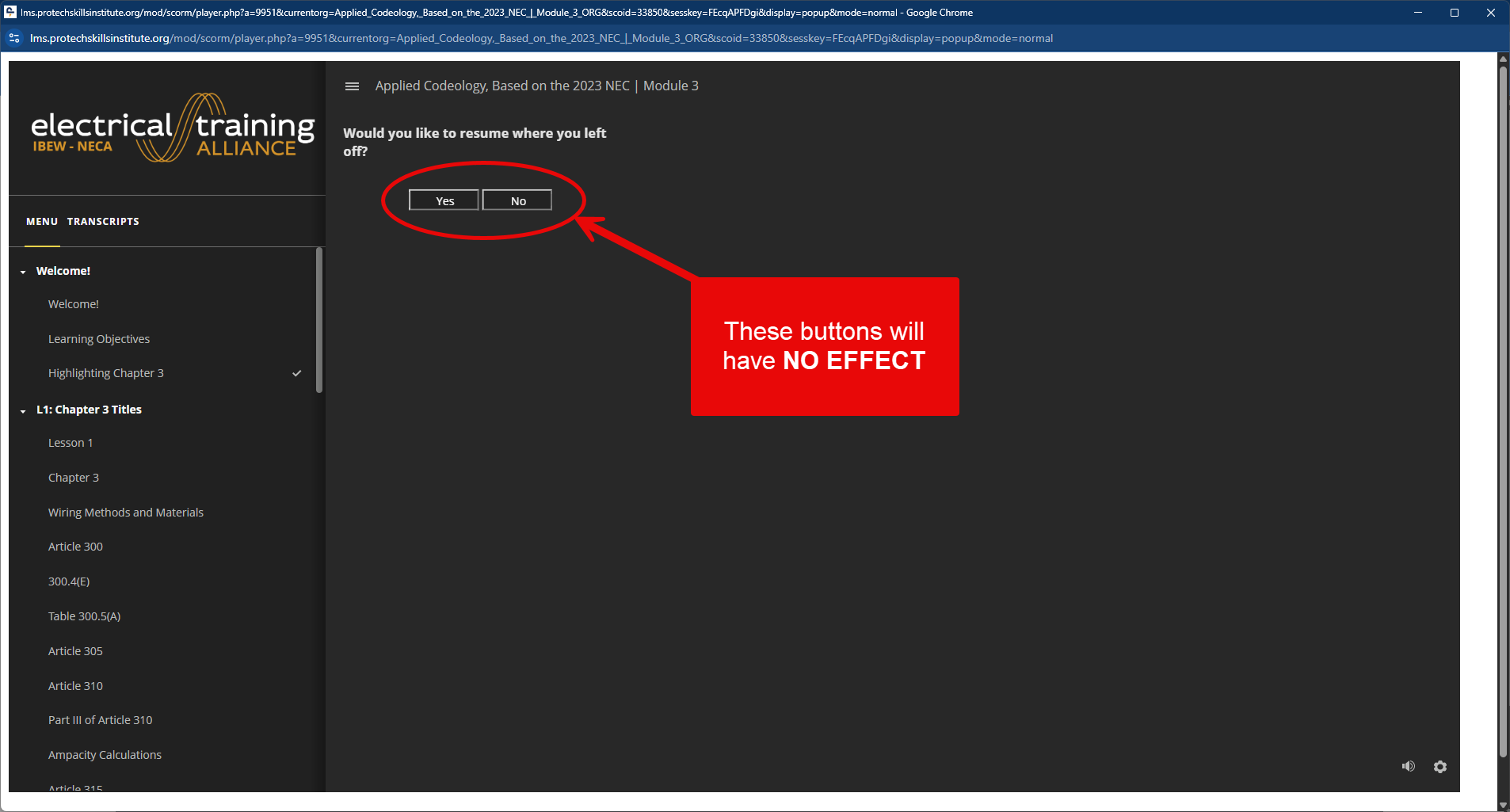 If they select Resume, the slide in the module will not do anything.